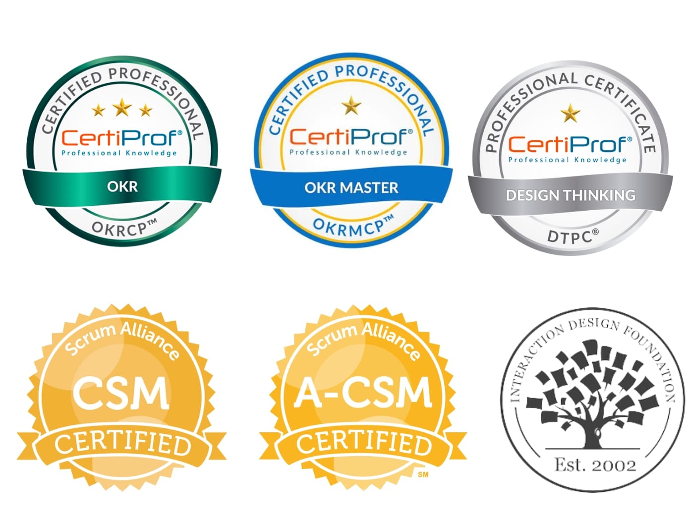 Nuestros equipos están compuestos por profesionales altamente capacitados, respaldados por diversas certificaciones que incluyen PMP, CSM, A-CSM, OKR Pro, IPMA Level D, Agile coach Lean e Interaction Design Foundation, entre otros.
